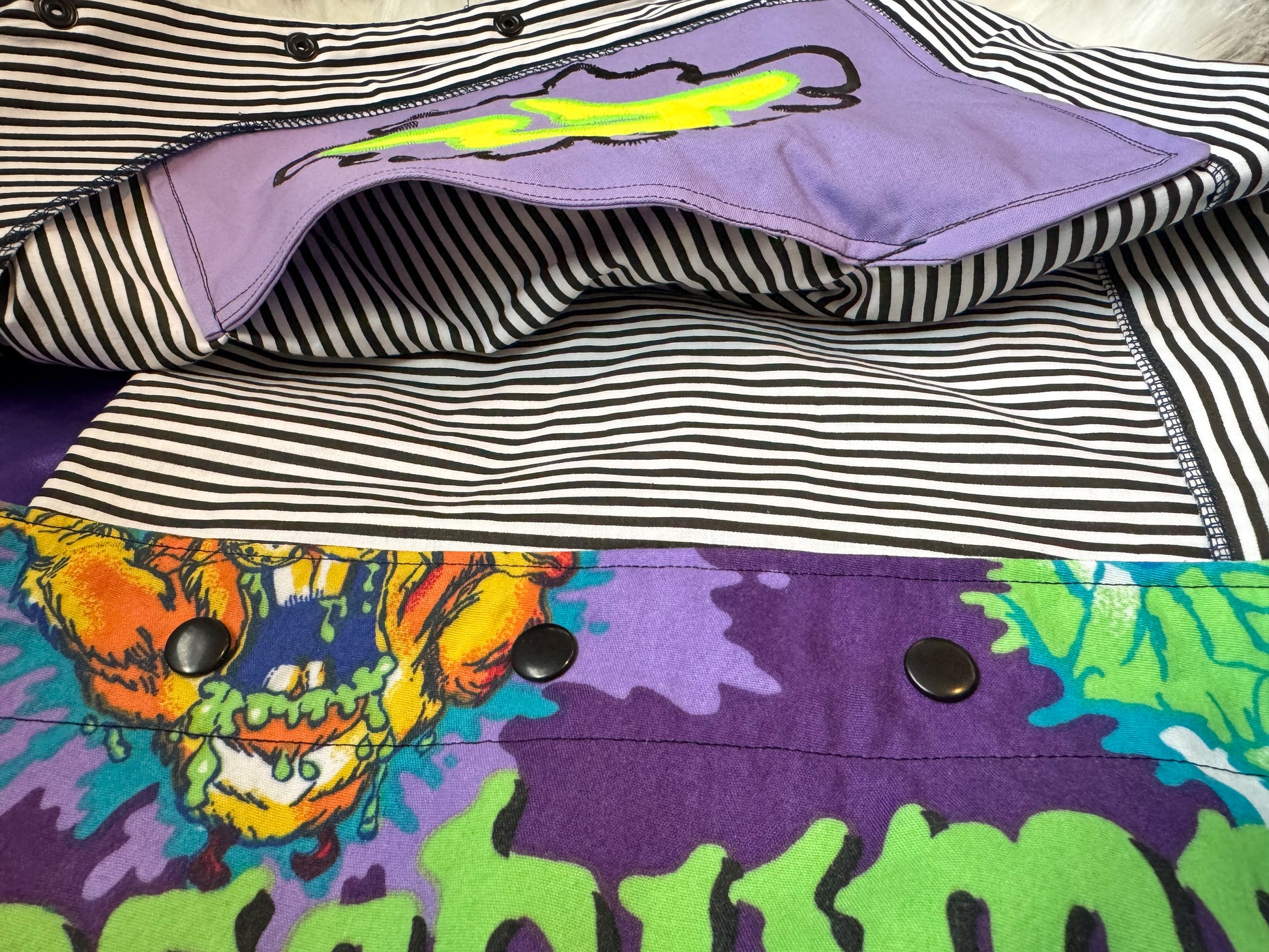 Step straight into nostalgia with this trendy cropped Goosebumps jacket. Handmade from an authentic vintage R.L. Stine bedsheet! Every stitch reimagines spooky childhood memories.